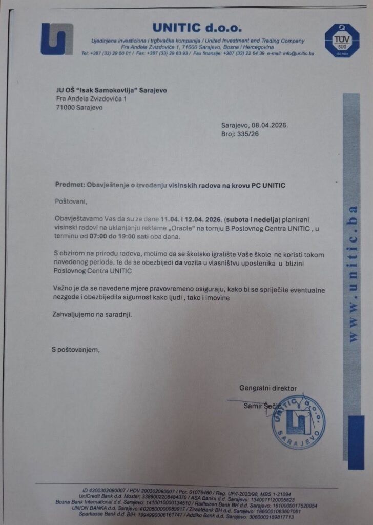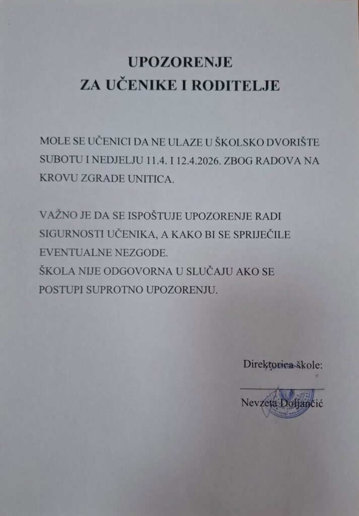 9. Aprila 2026. 0 Posted by: medina Obavještenja Previous Story Obavijest i čestitka povodom Uskrsa Next Story Korisnici Zavoda za socijalno zbrinjavanje Pazarić prisustvovali inkluzivnoj radionici u našoj školi