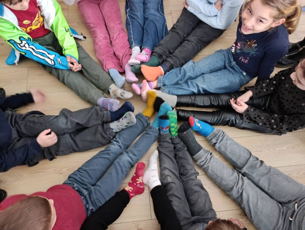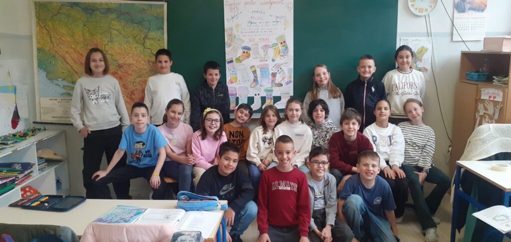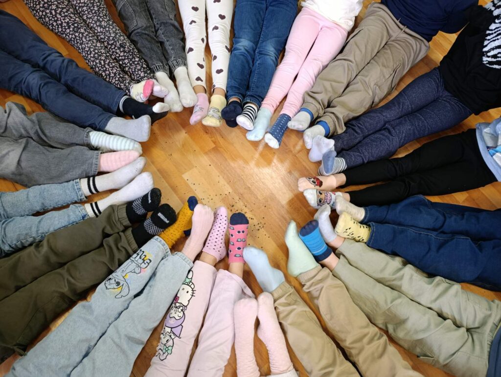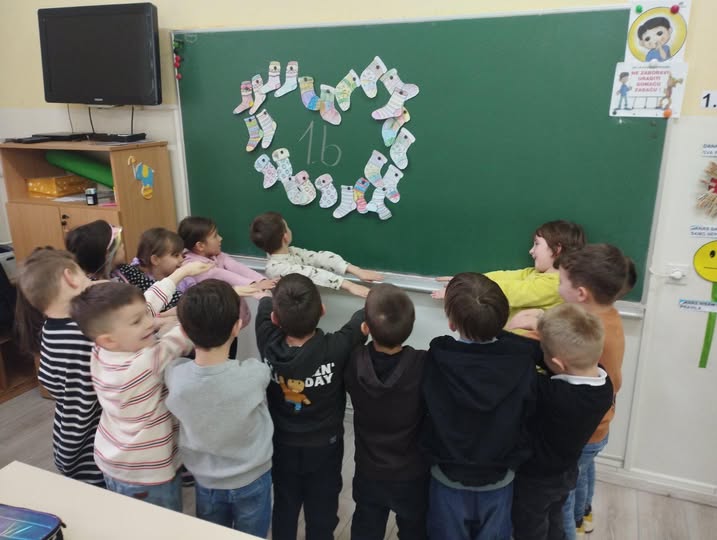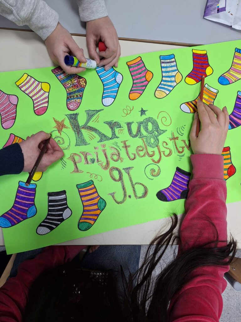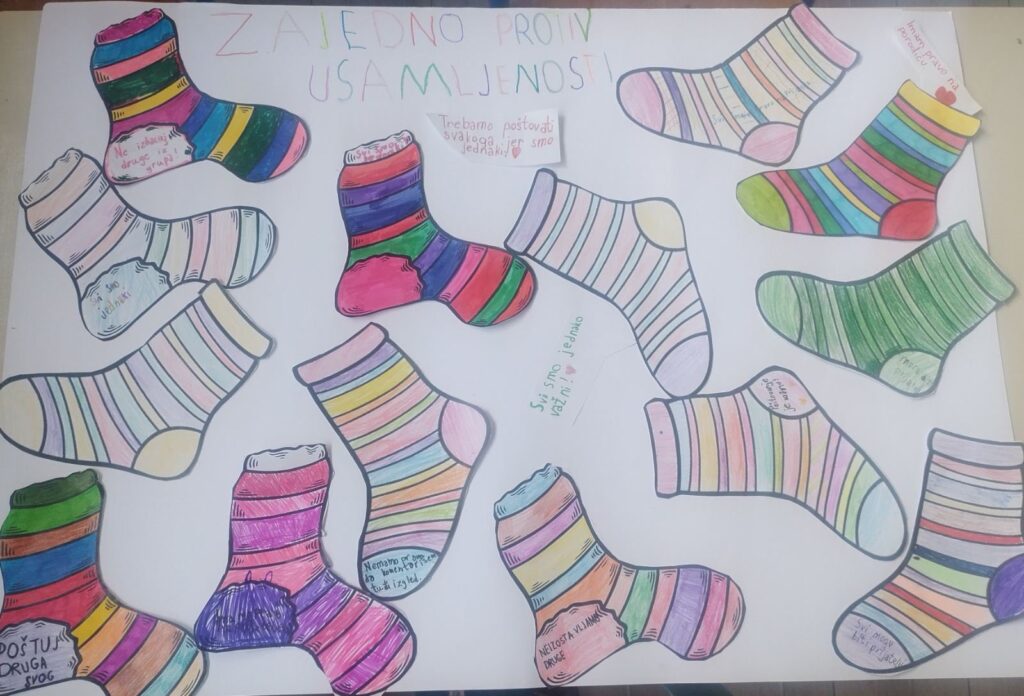 Učenici su bojili različite čarape i ukrašavali ih šarenim bojama, prugama i tačkicama. Razgovarali su o tome šta znači imati prijatelja i kako možemo pomoći nekome ko se osjeća sam. Naučili su da je važno da svi budemo dio “kruga prijateljstva” i da niko ne bude usamljen.