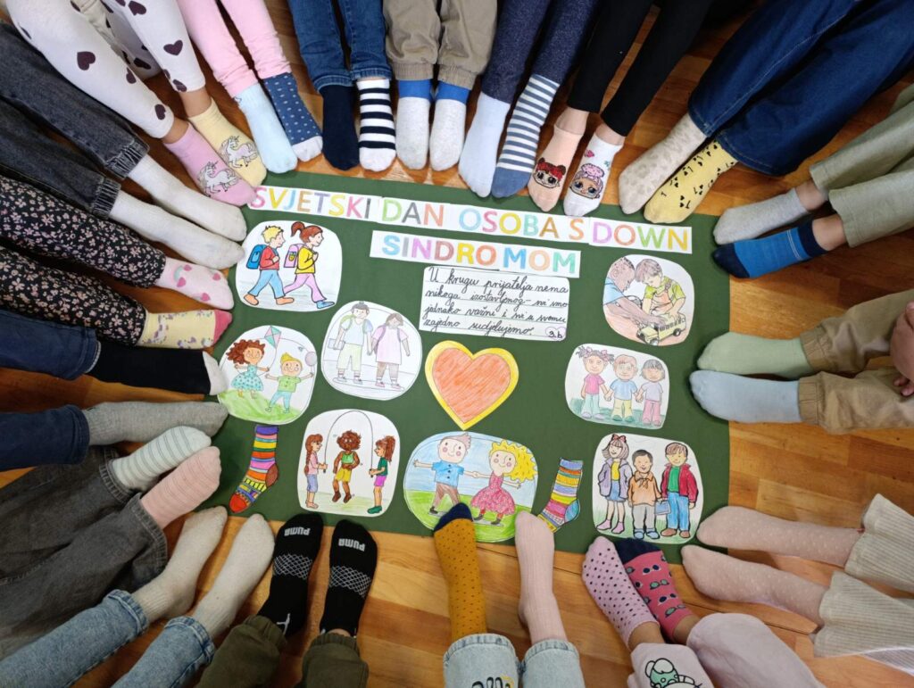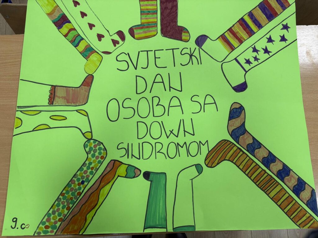 Učenici 4.b odjeljenja obilježili su Svjetski dan osoba s Down sindromom kroz niz kreativnih i emotivnih aktivnosti. Izradili su plakat s prigodnim porukama, te su uz puno truda i mašte pravili, rezali i bojili papirne čarape u koje su unosili poruke podrške, prijateljstva i prihvatanja različitosti.