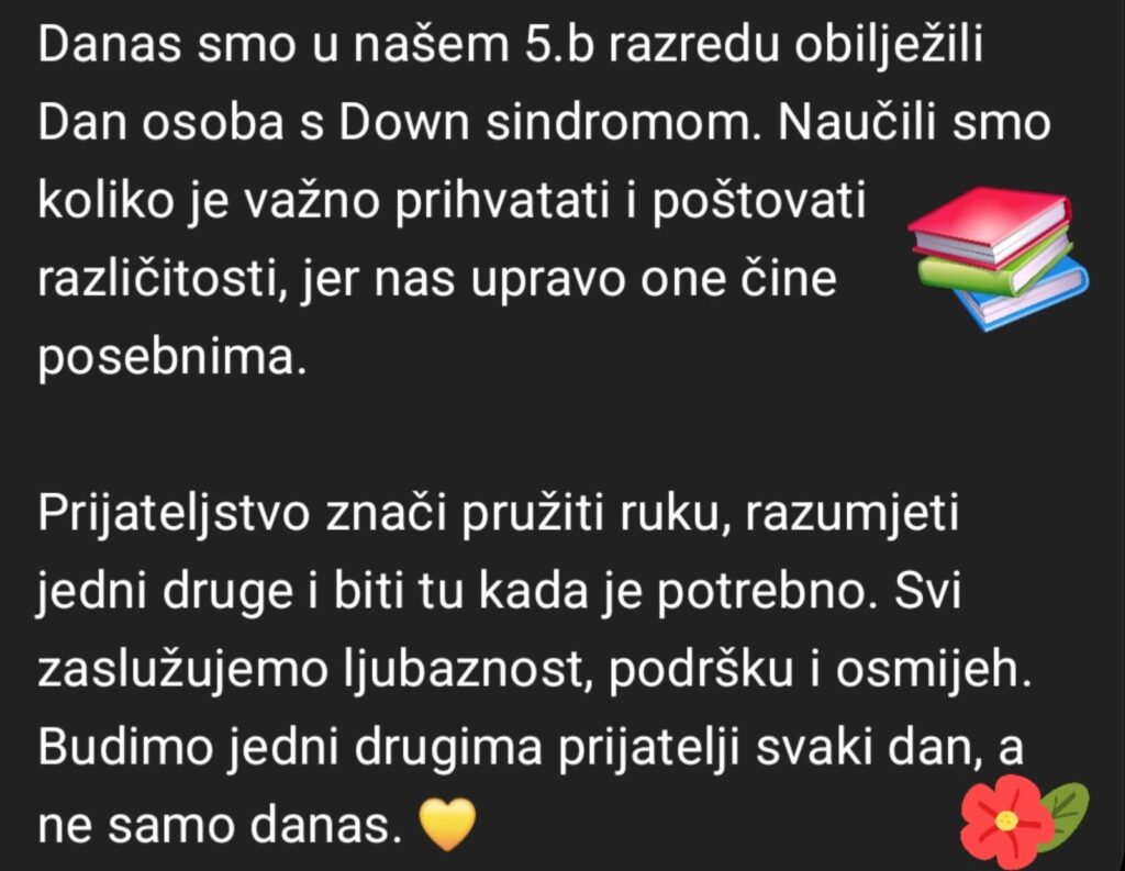 Učenici 1.a su obiljeljižili Svjetski dan osoba s Down sindromom. Kroz različite aktivnosti pokazali smo koliko je važno prijateljstvo, zajedištvo i pomoć drugima. Različitost je snaga koja nas čini posebnima i podsjeća nas na to da smo svi jednako vrijedni.